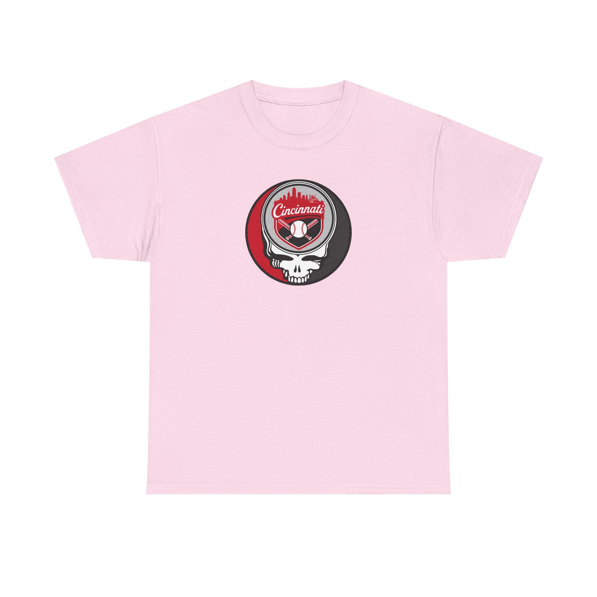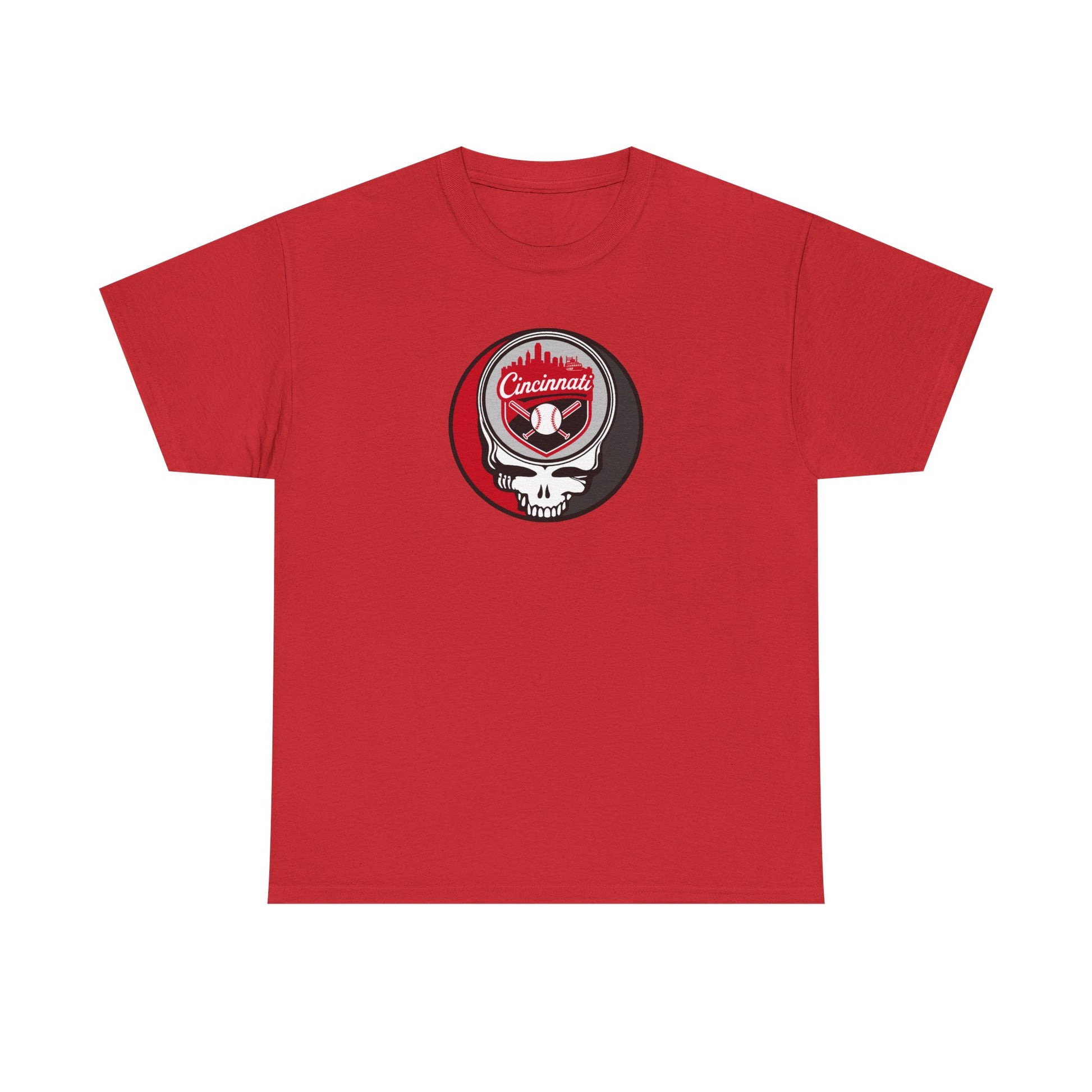 Celebrate the Fusion of Baseball Legacy and Musical Icon: Embrace the harmonious blend of the Cincinnati Reds and Grateful Dead with this exclusive t-shirt! The legendary "Steal Your Face" artwork is reimagined in Reds colors, merging team pride with the iconic Grateful Dead symbol.