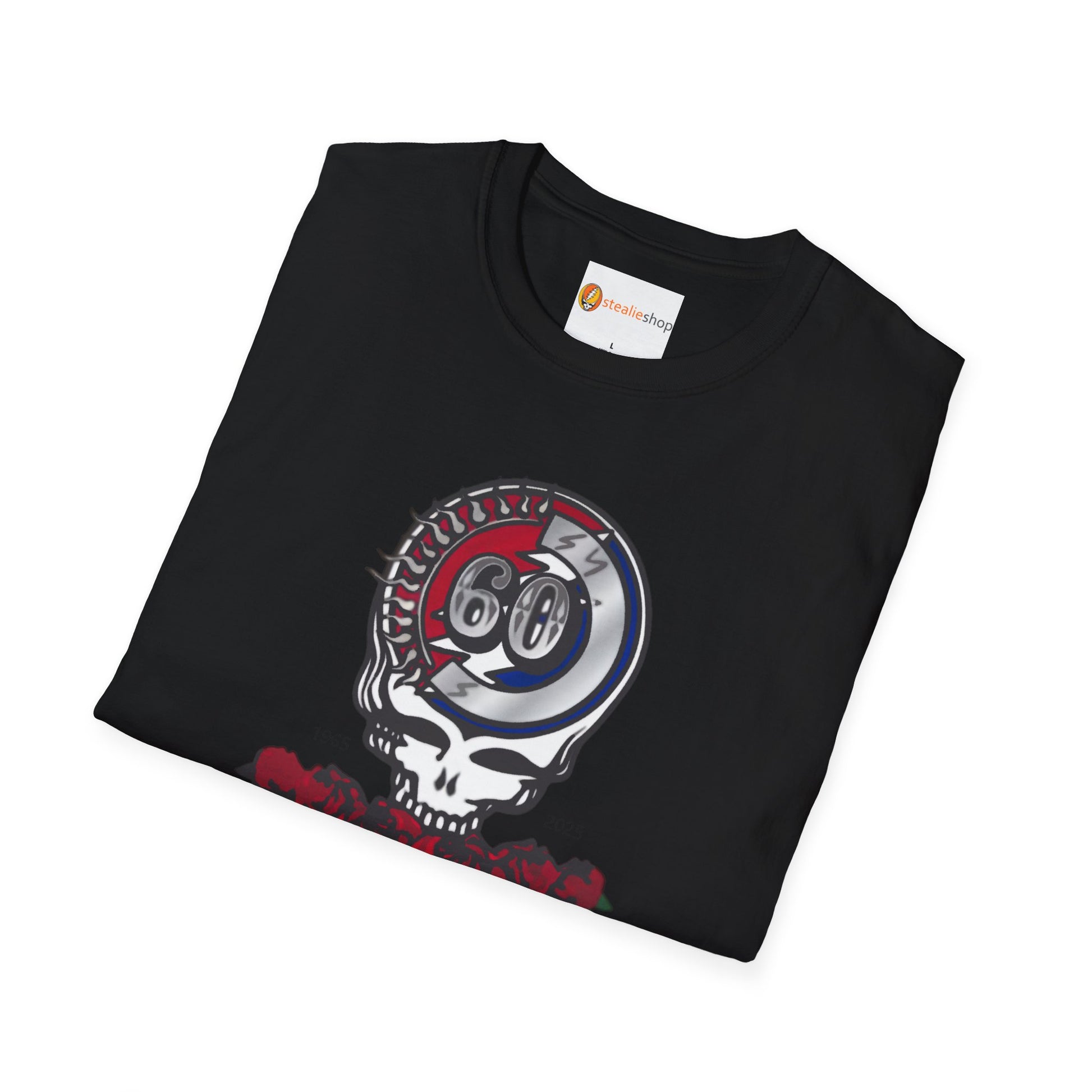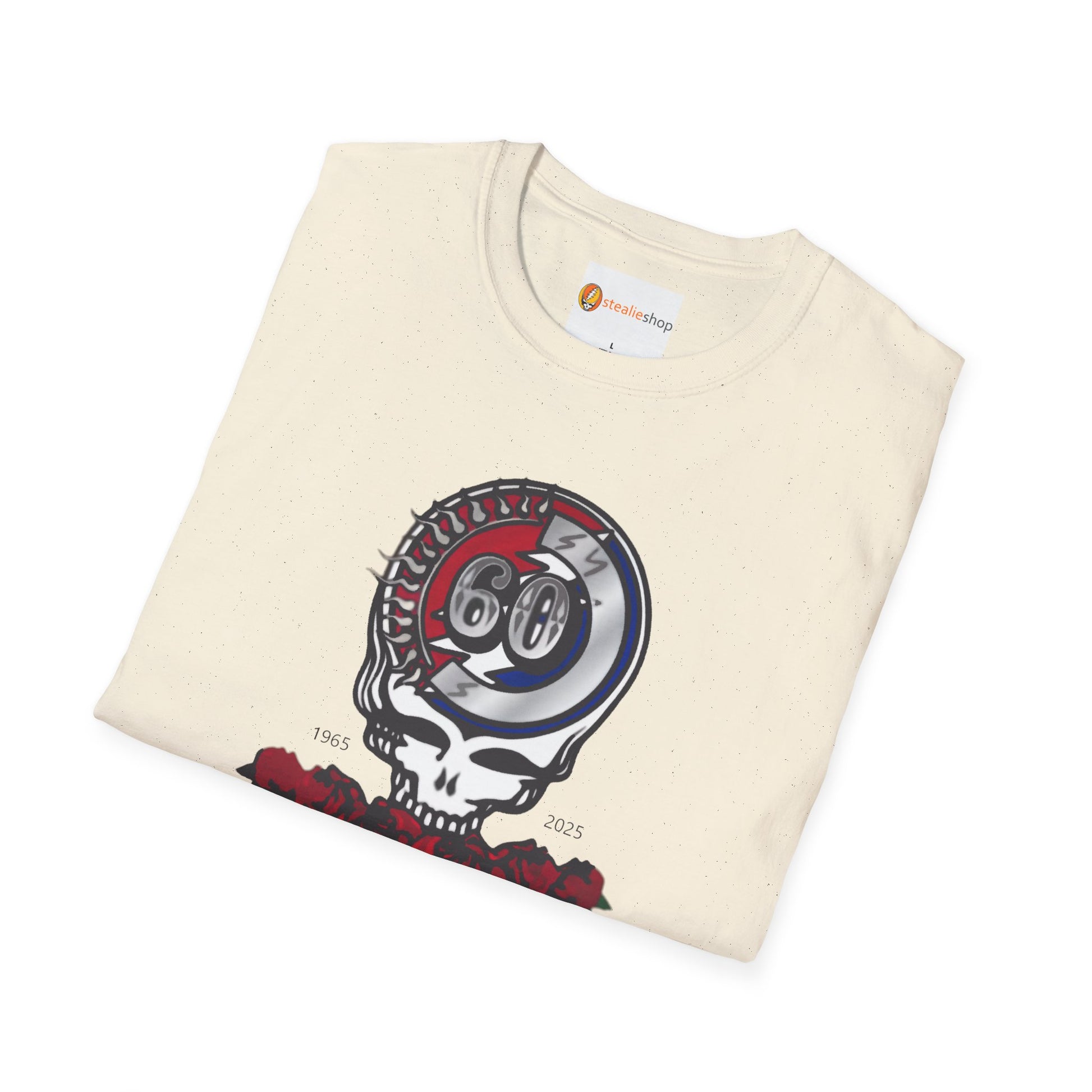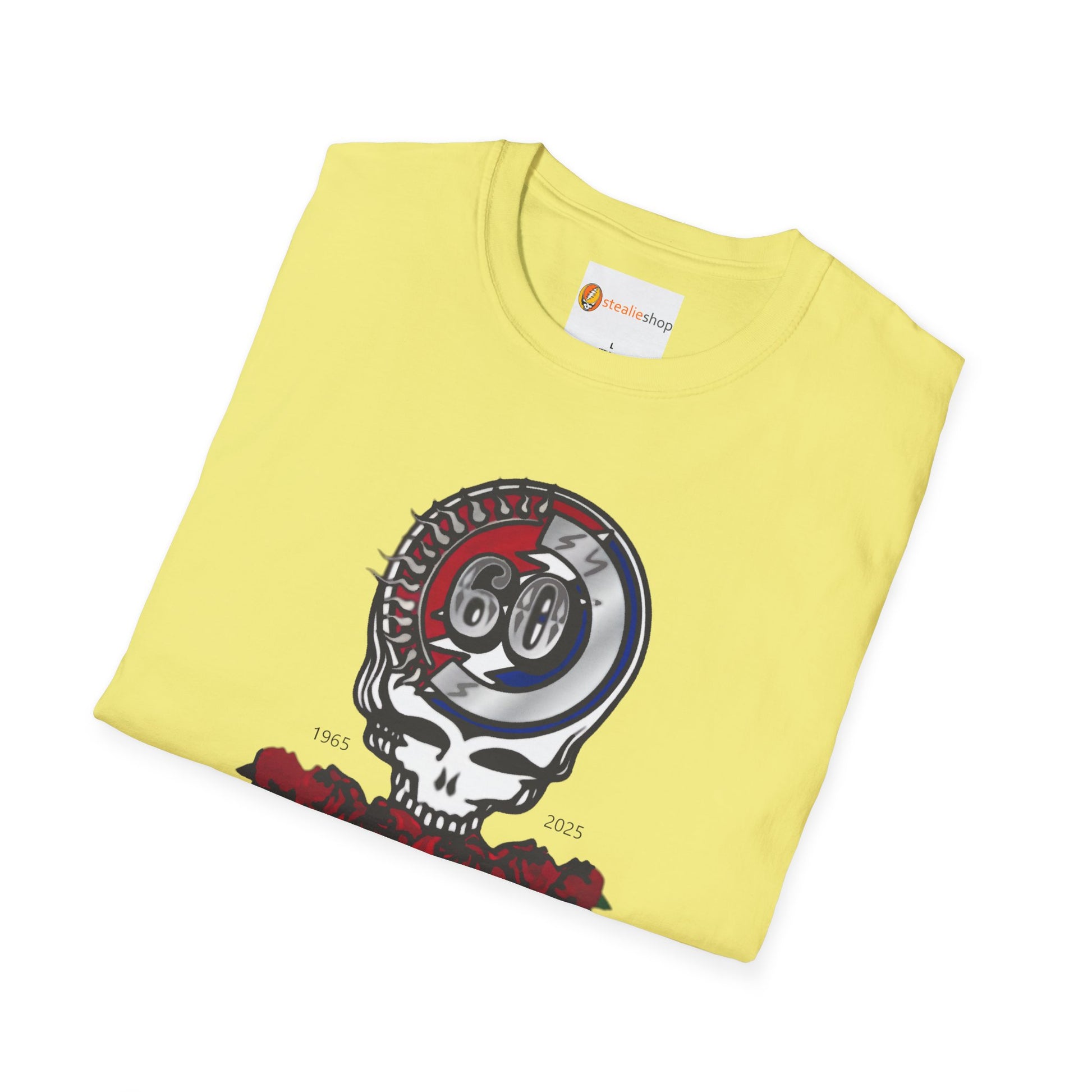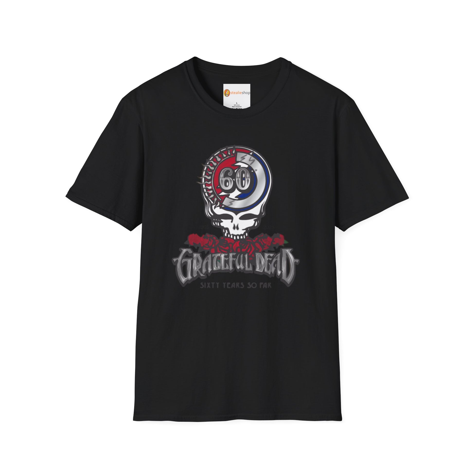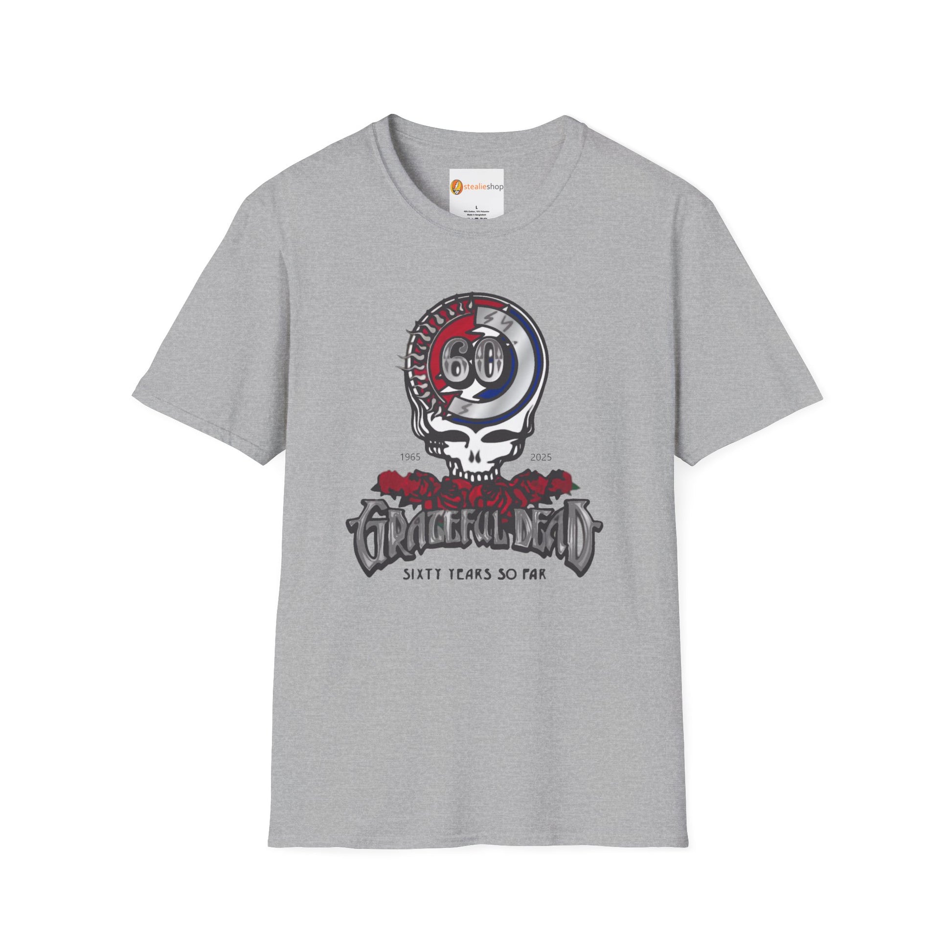 Hey Deadheads! Elevate your style with this Grateful Dead 60th Anniversary Tshirt, featuring the 60th Anniversary Steal Your Face logo. This tee is the ultimate way to showcase your love for the Dead for all these years, while staying comfy and cool.