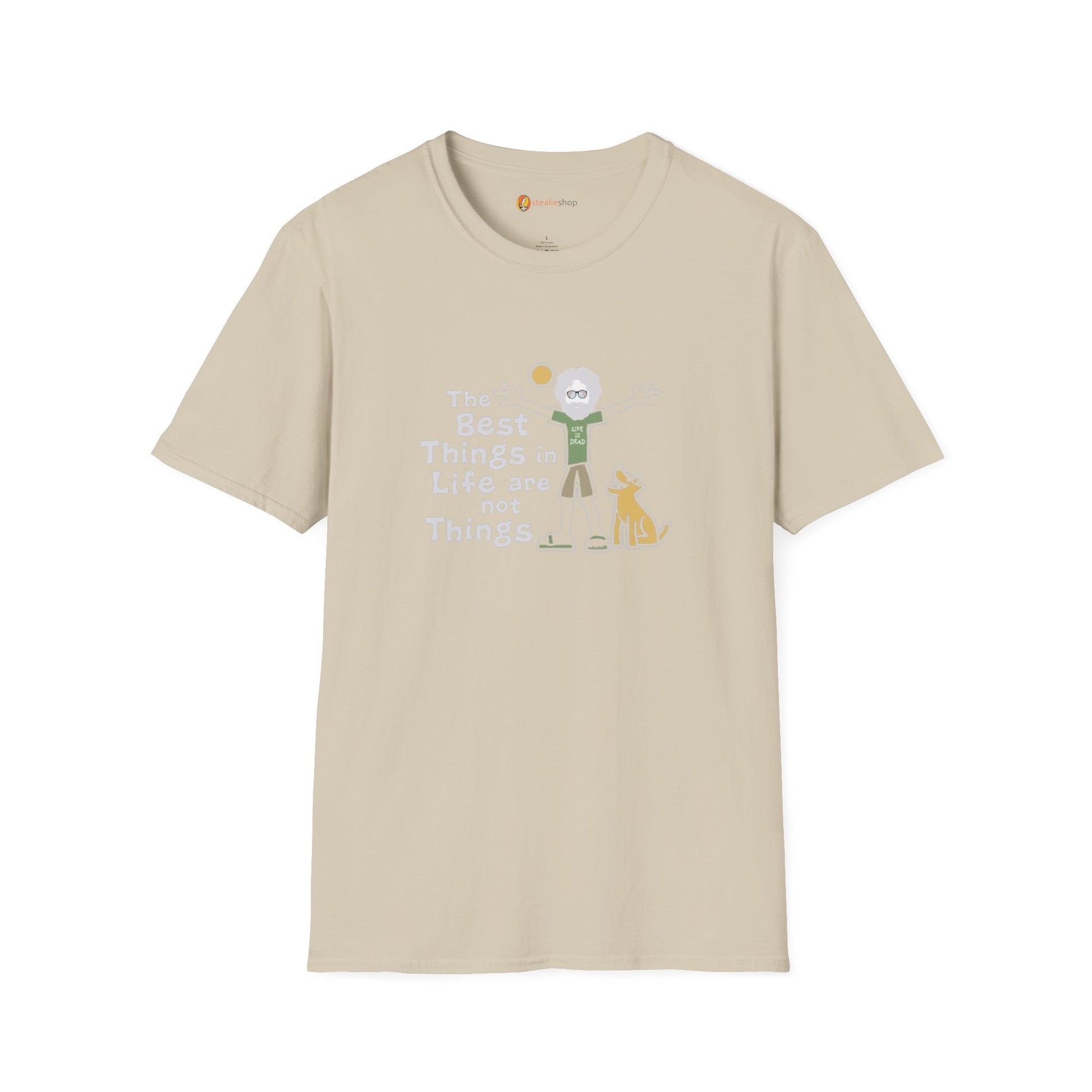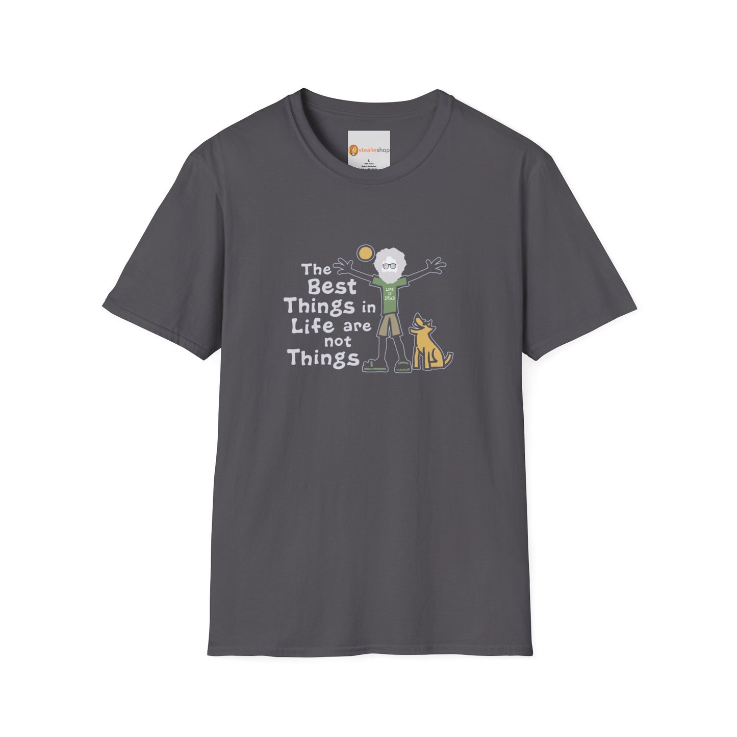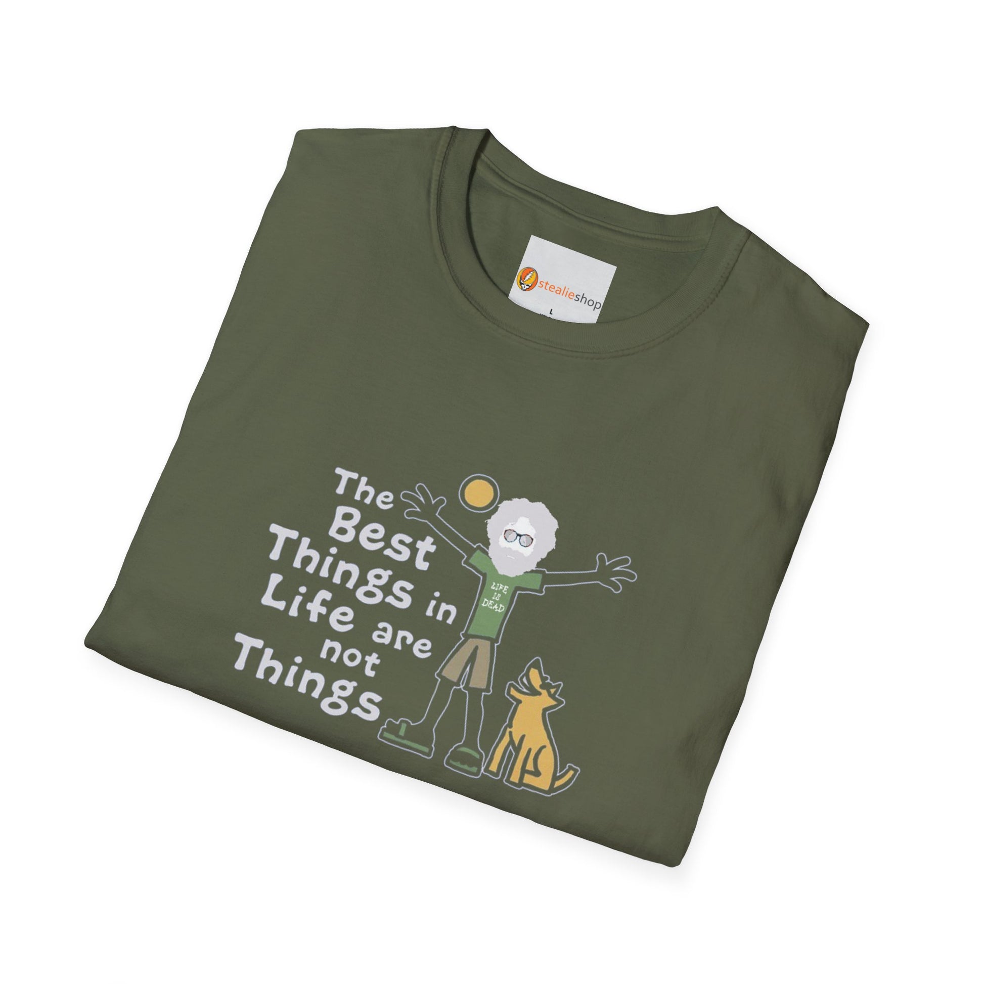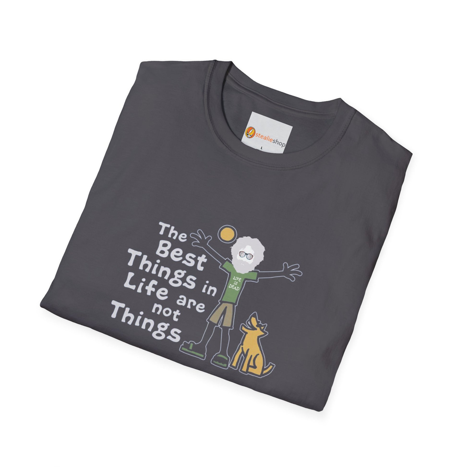 - **Design**: Features a heartwarming image of Jerry Garcia celebrating life with his pup, accompanied by the phrase "The Best Things in Life Are Not Things," adding a whimsical and meaningful touch to your outfit.