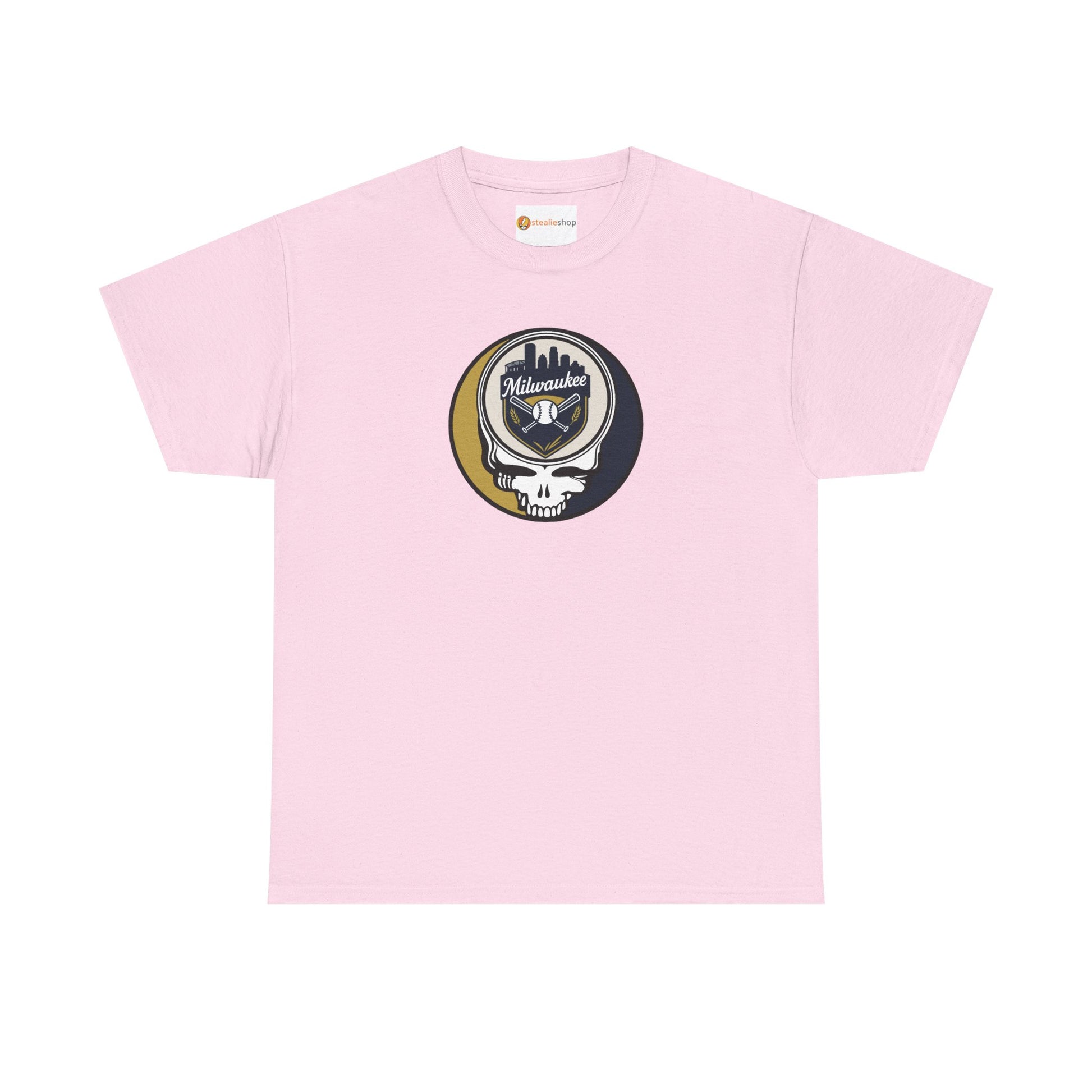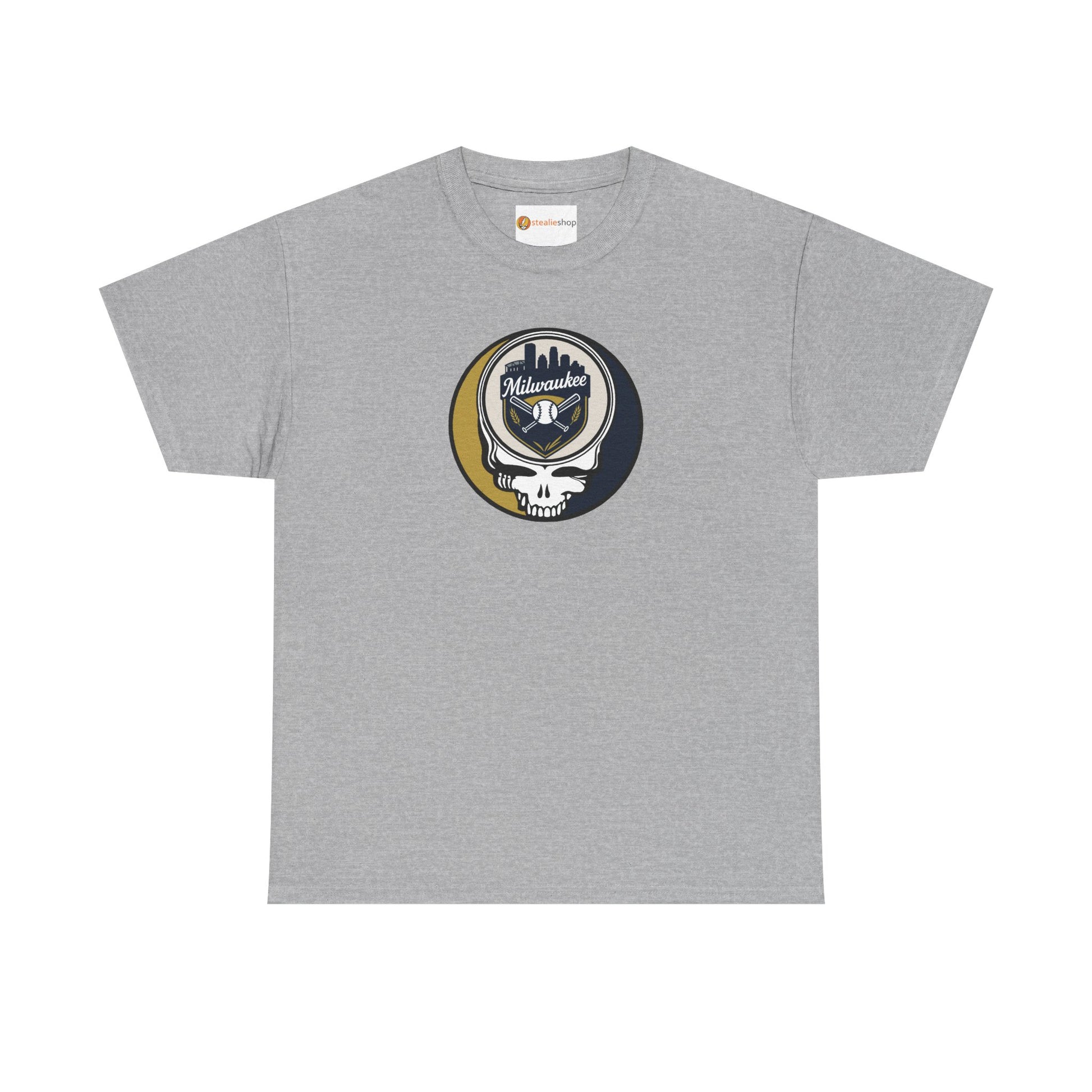 Celebrate the Fusion of Baseball Legacy and Musical Icon: Embrace the harmonious blend of the Milwaukee Brewers and Grateful Dead with this exclusive t-shirt! The legendary "Steal Your Face" artwork is reimagined in Brewers colors, merging team pride with the iconic Grateful Dead symbol.
