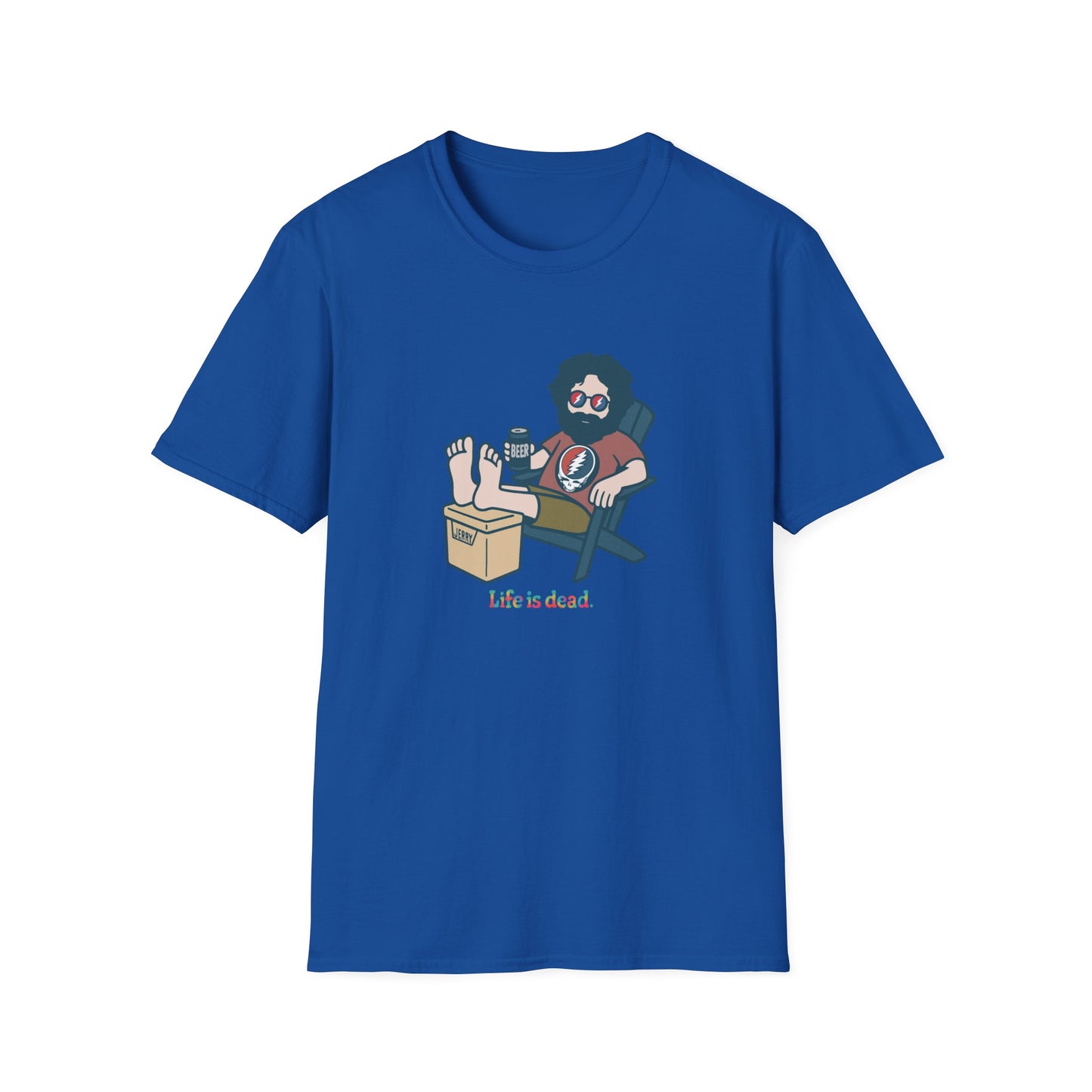 Keep the chill vibes alive with the Life is Dead T-Shirt, featuring Jerry Garcia kicking back with his feet up on a cooler filled with his favorite beverages. This tee captures the essence of relaxation and the joy of unwinding in true Deadhead style.