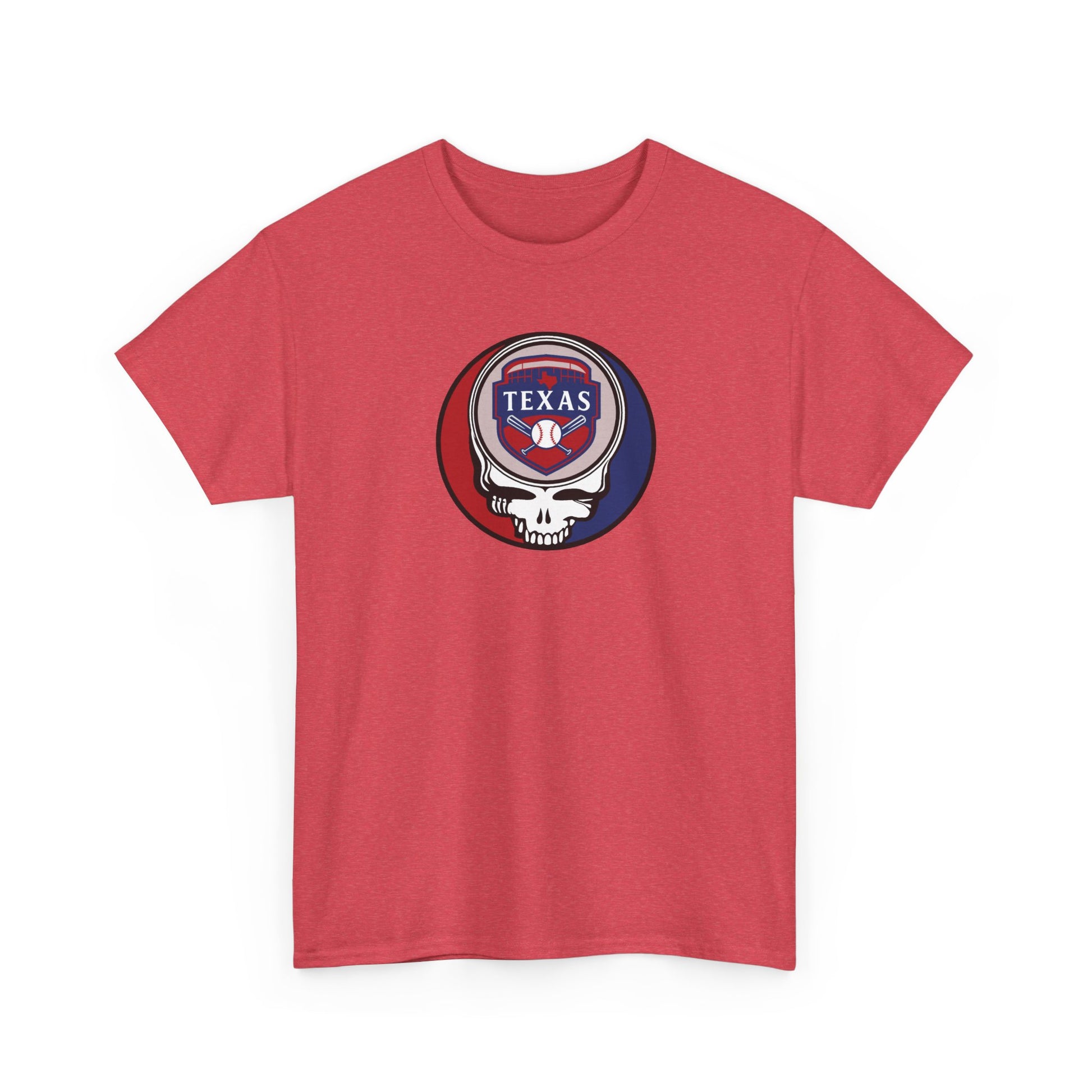 Celebrate the Fusion of Baseball Legacy and Musical Icon: Embrace the harmonious blend of the Texas Rangers and Grateful Dead with this exclusive t-shirt! The legendary "Steal Your Face" artwork is reimagined in Rangers colors, merging team pride with the iconic Grateful Dead symbol.