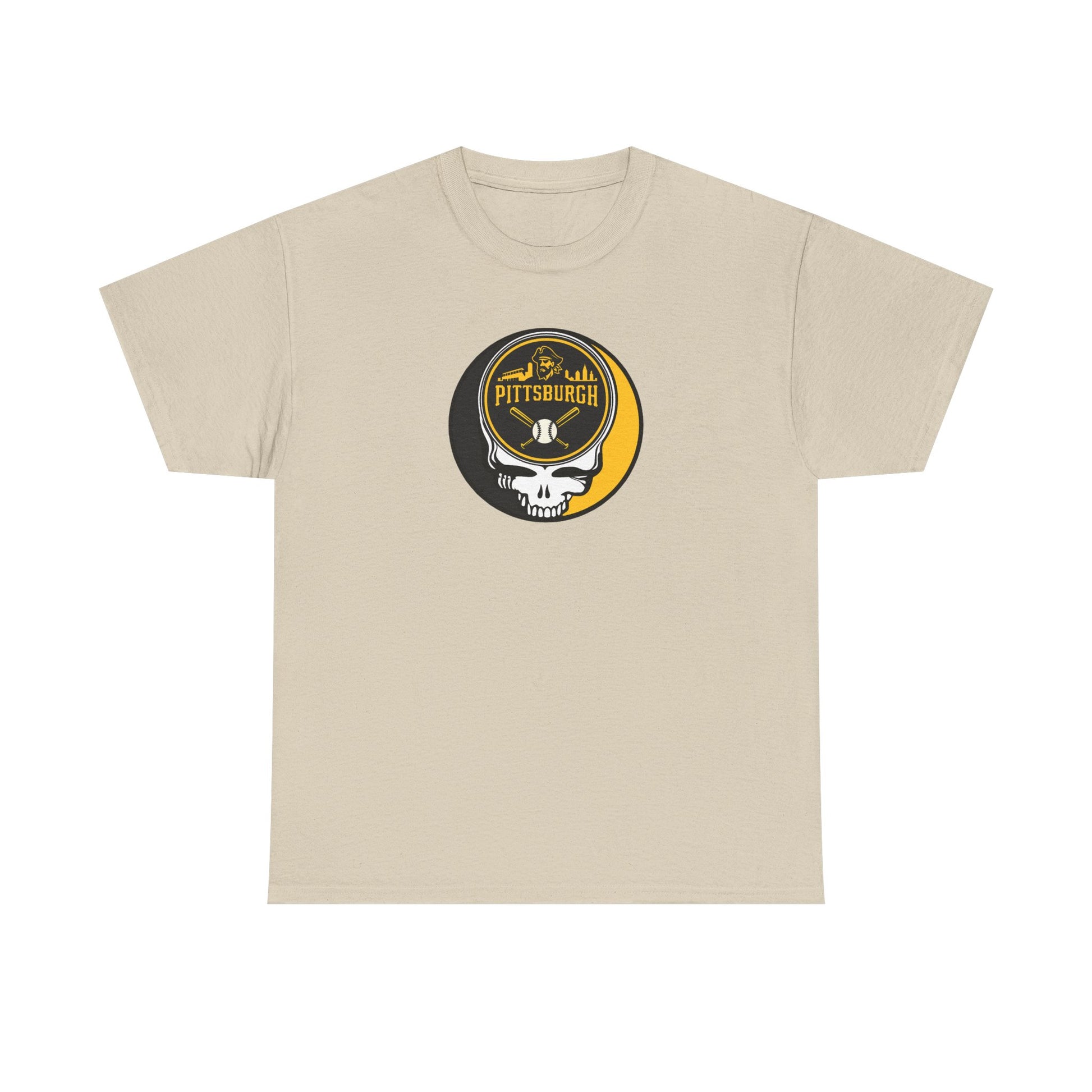Celebrate the Fusion of Baseball Legacy and Musical Icon: Embrace the harmonious blend of the Pittsburgh Pirates and Grateful Dead with this exclusive t-shirt! The legendary "Steal Your Face" artwork is reimagined in the Pirates colors, merging team pride with the iconic Grateful Dead symbol.